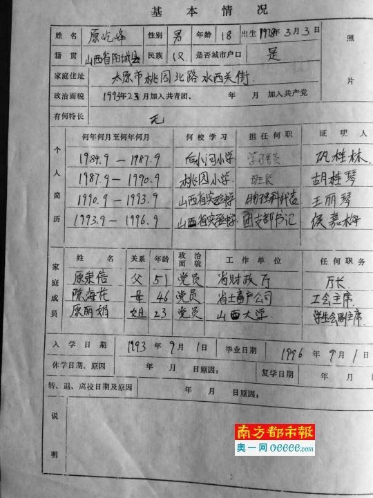 南都记者查阅到的档案资料显示,从小学到大学,原屹峰读的都是名校,也一直是班干部,还曾获得省级优秀学生干部等荣誉称号。